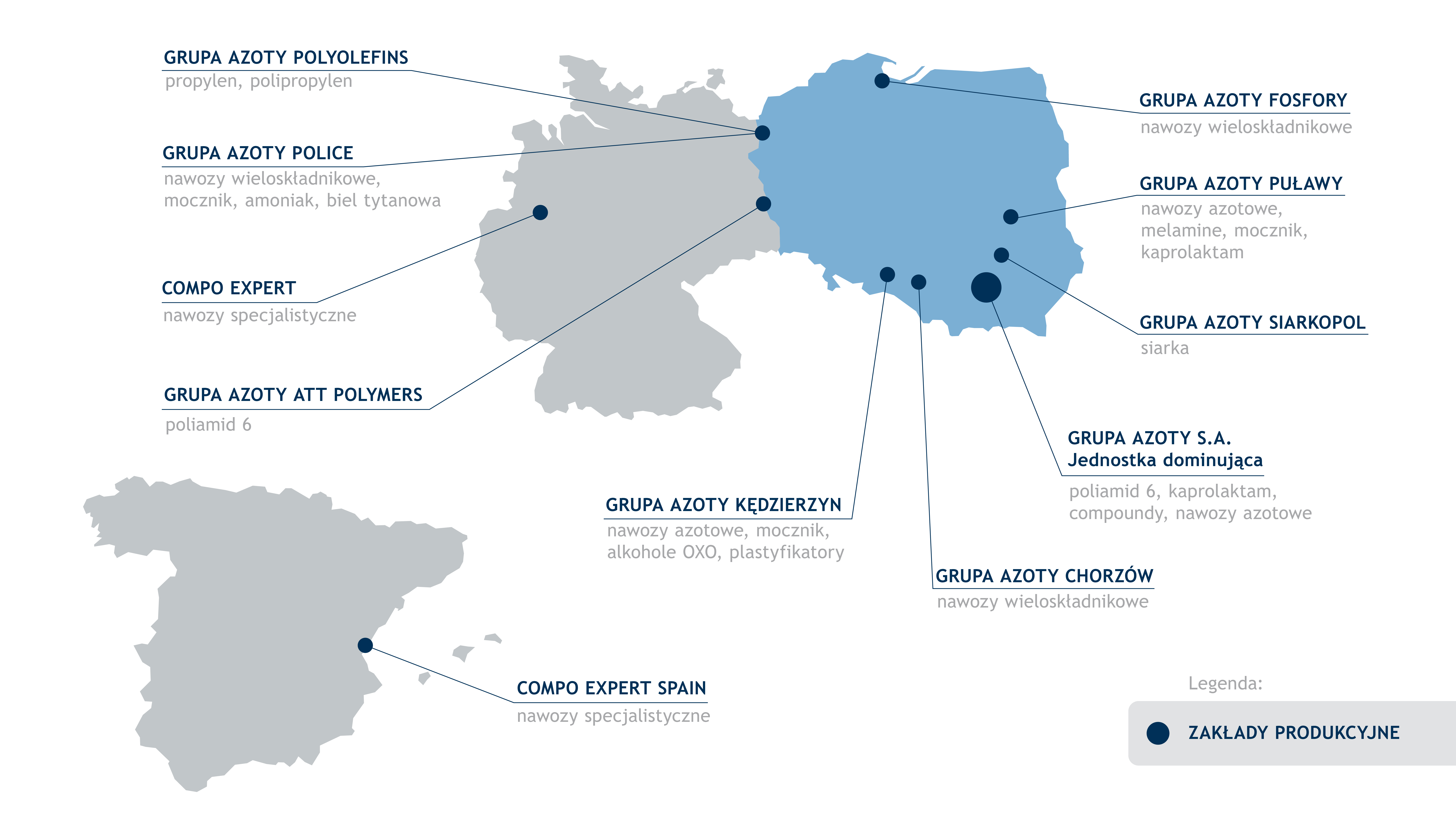Grupa Azoty to ponad 50 spółek zlokalizowanych na terenie Polski i świata. Nasze produkty sprzedawane są do ponad 100 krajów.